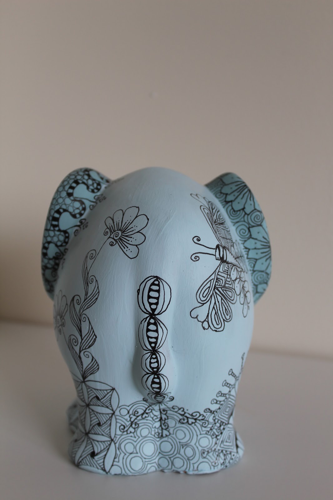 Mum bought back from France this old ceramic elephant that had seen better days and so I set about upcycling :-) A coat or two of acrylic eggshell furniture paint and then lots of zentangling with black fineliners.